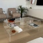 שולחן מפרספקס שקוף עם 4 רגליים עשוי בכיפוף והדבקה, משמש כשולחן קפה ונוי בחלל החדר.