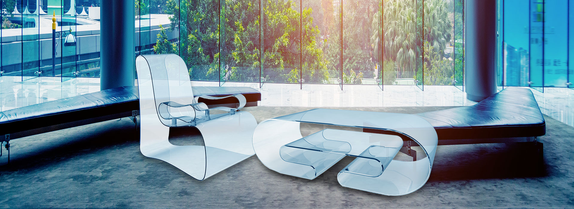 כיסא ושולחן שקופים מעוצבים בסגנון מודרני בחלל פנימי עם תאורה טבעית.