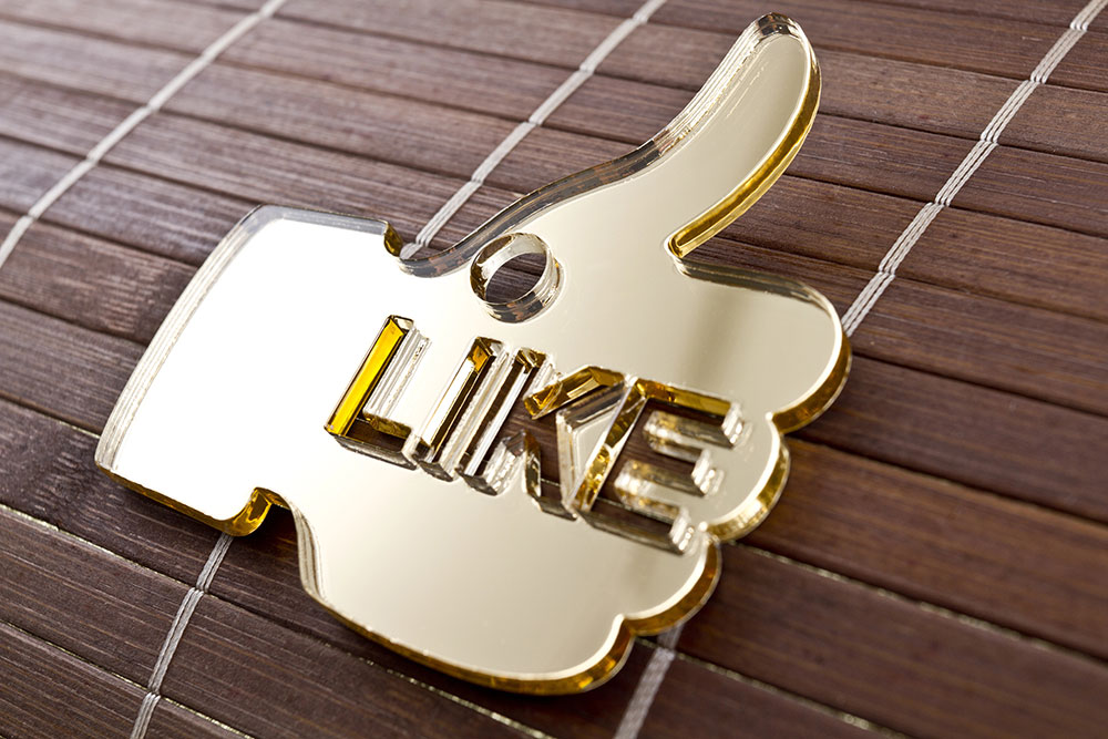 סמל לייק בצורת יד עם אצבע מורמת בצבע זהב, מוצב על רקע עץ כהה. מתאים לשימושים שונים.